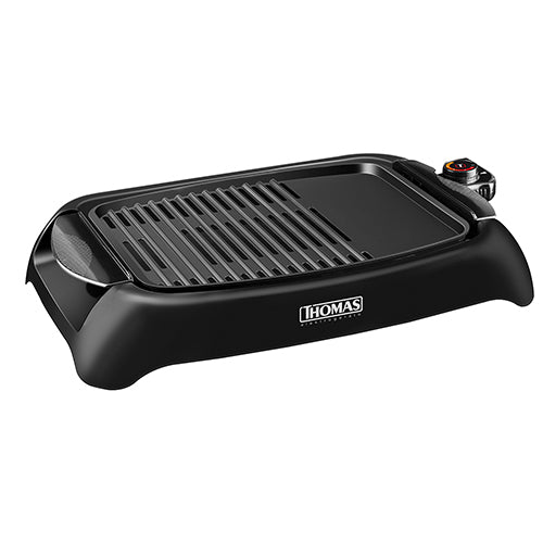 Parrilla eléctrica TH-180 de THOMAS. Con este producto podrás preparar tus recetas en dos superficies de cocción, estas superficies son antiadherentes y desarmables para su fácil limpieza. Además, esta parrilla posee 5 niveles de potencia por lo que podrás seleccionar la que más te acomode según la preparación que desees. Finalmente, su diseño está pensado para que la puedas trasladar a cualquier parte de fácil manera.