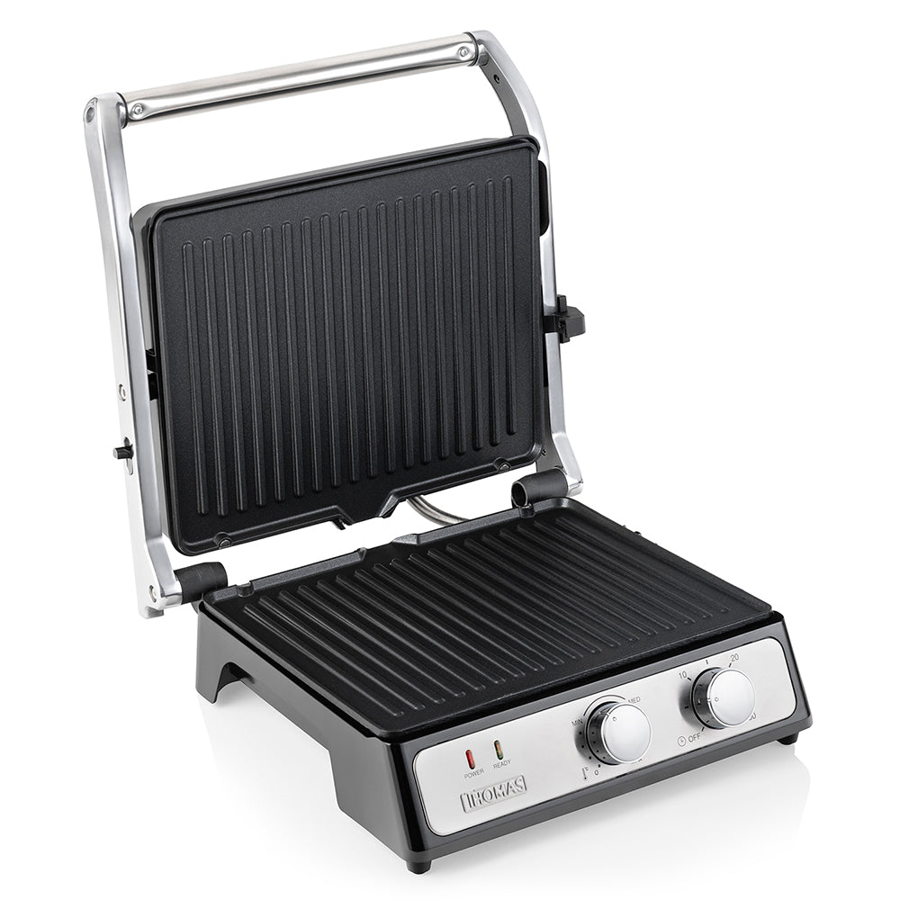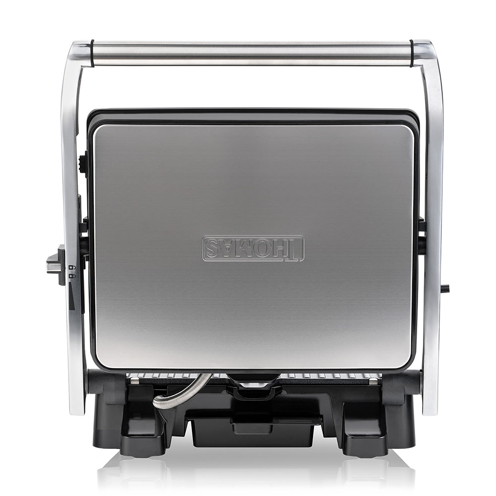 Superficie de acero inoxidable, Placas antiadherentes extraíbles, Regulador de temperatura con termostato, Timer, Regulador de altura y fijación de apertura, Mangos de aluminio de alta resistencia, Superficie fría al tacto.